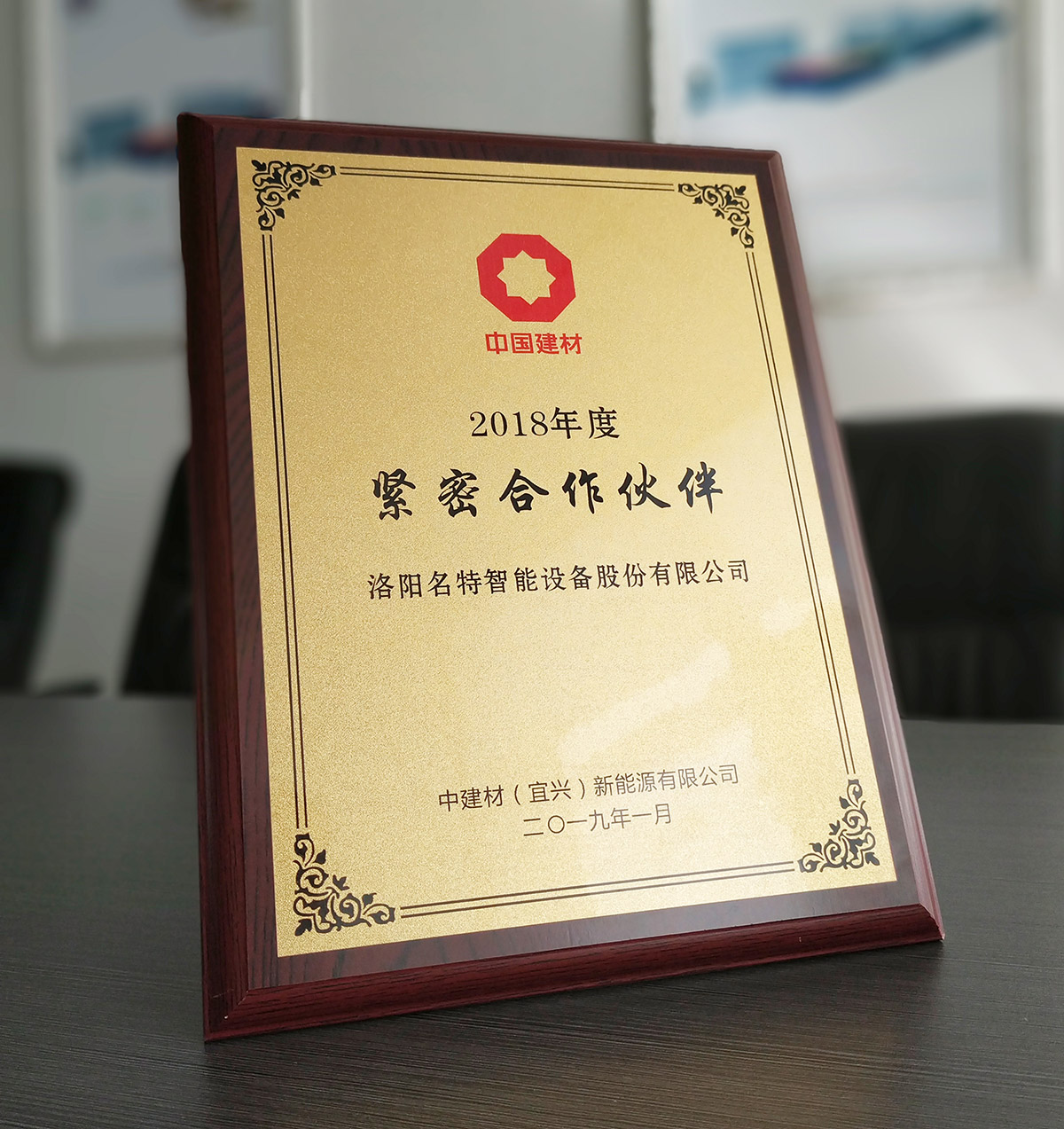 2019年初,我公司榮獲中建材(宜興)新能源有限公司授予的“2018年度緊密合作伙伴”殊榮!